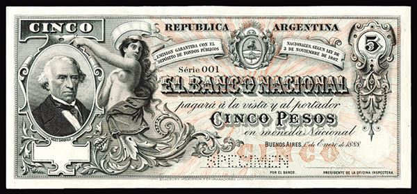 Argentina. P-S1093as. Uniface face specimen, unlisted in this form. Sarsfield and female allegory at left end. Perforated SPECIMEN. With pencil R notation on back. Extremely Fine to AU with the appearance of better.
