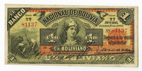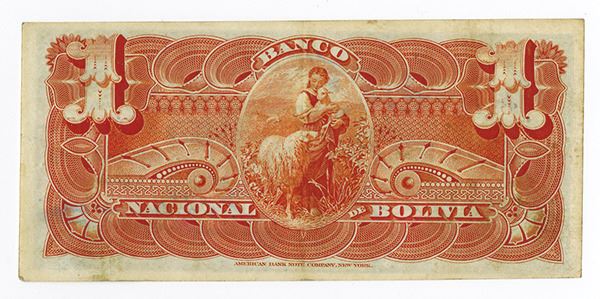 Bolivia, 1 Boliviano, Series TT, P-S211b, Issued banknote, Black on orange and yellow, AU with evidence of handling. Attractive and scarce note. ABNC.