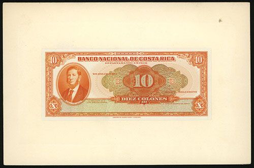 San Jose, Costa Rica. ND (ca.1942-49). P-210 Unlisted Proof. 10 Colones. Proof face printed in orange on india paper on large thin card, Choice Uncirculated condition. Scarce archival proof. ABNC.