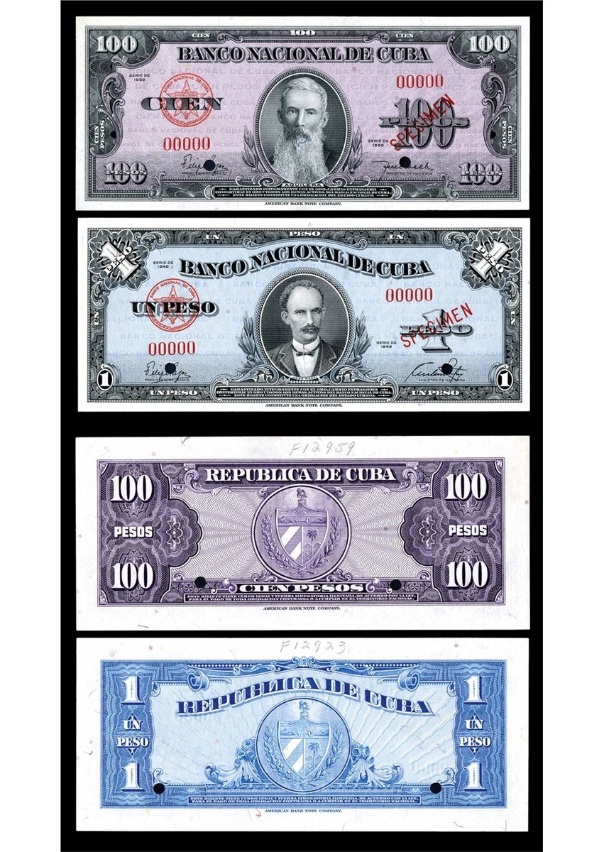 Cuba, Lot of 2 notes. Includes 1949, 1 Peso, P-77a Unlisted Specimen overprint, black on light blue, Marti in middle, back blue with arms, Choice Unc; 1950, 100 Pesos, P-82a unlisted Specimen overprint in English, Black on purple with Aguilera in center, back purple with arms, AU to Unc, both have red specimen overprints and POC's. ABNC.