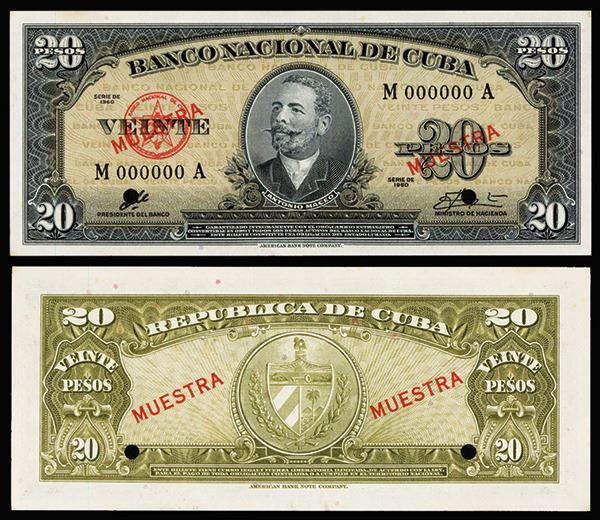 Cuba, 1960, 20 Pesos, P-80c, Specimen, Black on olive underprint, Maceo in center, back olive with Cuba Arms, "Muestra" overprints, "M 000000 A" serial numbers, POC's, "Che" signature as Presidente Del Banco, Choice to Gem Uncirculated Condition, Rare signature variety. ABNC.