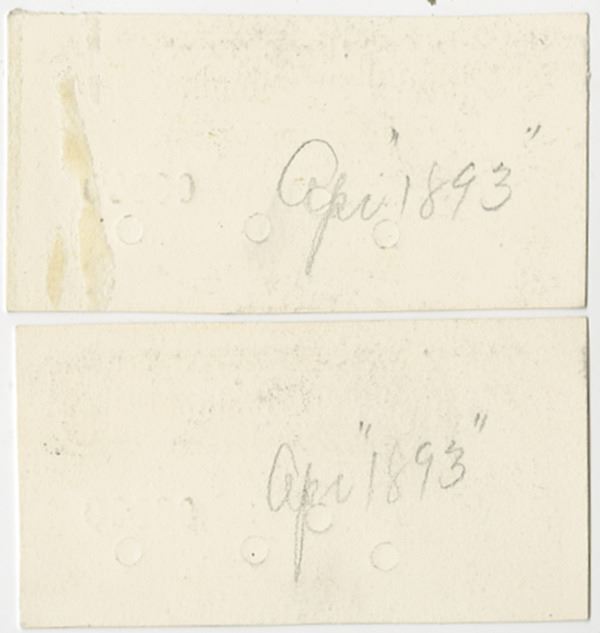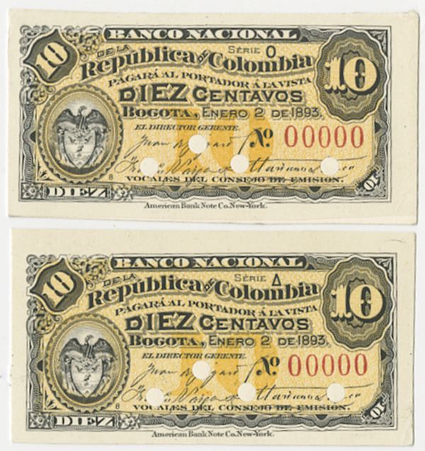Bogota, Colombia... Lot of 2 notes, both are 10 Centavos, Ser. O and Delta, P-221 Unlisted Proof Banknote pair, both Printed on india paper that is mounted on thin card and cut down to bank note size, black on light yellow and orange underprint, POC, "00000" Serial Numbers, Pencil notation on back "April 1893", Uncirculated to CU but the card has light green mounting remnants that does not effect the note. ABNC.