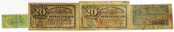 Bogota, Colombia. Lot of 3 notes, Includes 10 cents, P-262 and 20 cents, P-265(2), all issued, VG to Fine condition. Also includes a Mexican revenue stamp overprinted Pachuca.
