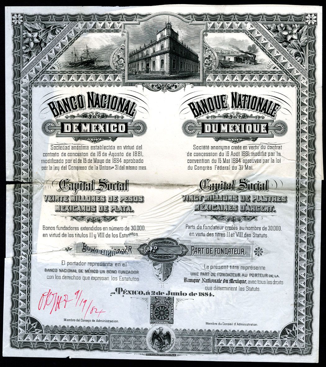 Mexico, 1884. Proof bond. Bono Fundador. Bank building in middle, steamship on left and locomotive on right. Arms of Mexico. Mexican proof revenue stamp on bottom above eagle. No Coupons. Appears Fine with archival folding for storage, internal tears in middle left and 3 inch tear on right middle and separating at left fold, Printed on india paper and only partially mounted on thin card. ABNC. Rare and possibly unique proof bond.