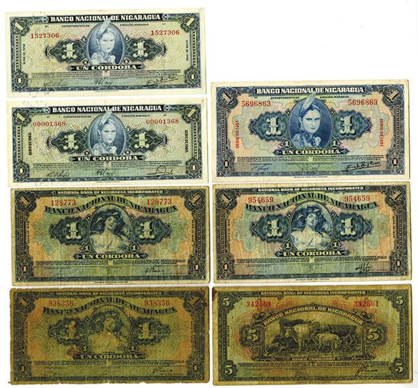 Nicaragua, lot of 6 notes, Include 1938-1939, 1 Cordoba, P-63b, (3) VG to VF, ABNC; 1938, 5 Cordobas, P-65b, Fine, ABNC; 1951, 1 Cordoba, P-91b, Choice VF, ABNC; and 1958 and 1960, 1 Cordoba, P-99b and 99c, Choice VF to XF. TDLR. Attractive banknote assortment.