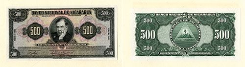 Nicaragua, 1945, 500 Cordobas, P-98 Unlisted Proof Face and Back notes, both printed on india on large card, the face is separating and could possibly be removed from its backing, Ruben Dario Portrait in middle, Scarce note and rare as proof. Choice to Gem Uncirculated. ABNC.