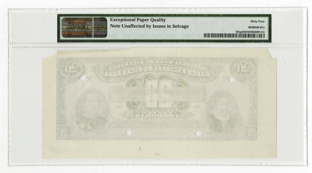 Nicaragua, 1912. 20 Cordobas. P-59sp Unlisted Color Trial Proof. Printed on india paper and unmounted. POC's. Black on light blue undertint that is printed slightly off register. Martinez on right and Cordoba on left. No serial numbers. Bottom and sides have large margins and the top is large but slightly smaller, Plate # 1511 on bottom margin. PMG graded 64 EPQ condition. Rare note. Hamilton BNC.