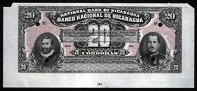 1912. 20 Cordobas. P-59 Unlisted Color Trial Proof. Printed on india paper and unmounted. POC's. Black on red-brown undertint that is printed slightly off register. Chammerra on right and Cordoba on left. No serial numbers. Bottom and sides have large margins and the top is large but not the same size. Unc. condition. Rare note.