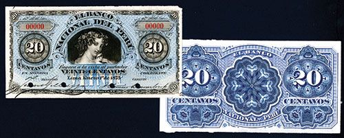 Lima, Peru, 1873, 20 Centavos, P-S301, unlisted face and back Proofs on india paper that is unmounted, black on light blue, S/N 00000, POC's, Young girl with bird in center, Uncirculated to CU with a small piece of excess UR corner tip missing but far from design, ABNC.