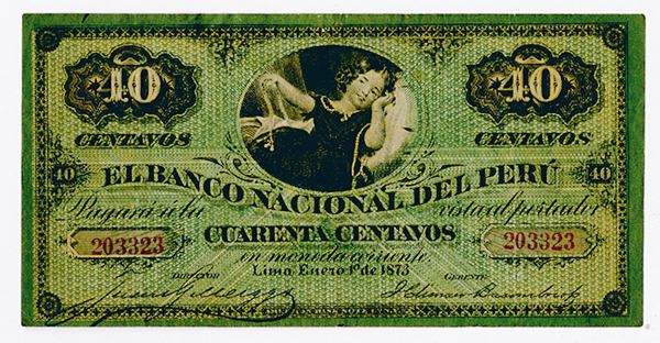 Lima, Peru. 1873, 40 Centavos, P-S302, Issued banknote, Black on green underprint, young girl reclining in middle, Signature titles: DIRECTOR and GERENTE. S/N 203323, Crisp VF condition with 2 small pin holes on the top middle margin and a small red ink area on the back top right margin, otherwise the note has sharp corners, firm paper body and bright colors that enhance this lovely little note. ABNC. Possibly one of the finest issued examples known of this note.