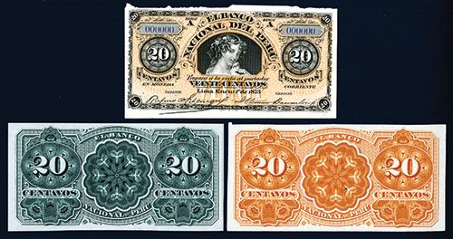 Lima, Peru, 1873, 20 Centavos, P-S304, unlisted face Proof with 2 different back proofs, one in orange and the second in green, the face is black on orange, young woman with bird at center, back orange, Ser.A, S/N 000000, Uncirculated to CU condition, ABNC.