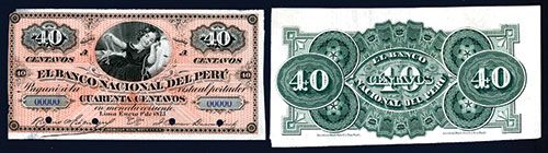 Lima, Peru, 1873, 40 Centavos, P-S305, unlisted face Proof printed on india paper that is unmounted, back proofs is from the 1st Issue, P-S302 and is in Green, the face is black on peach, young woman with pearls at center, Ser.A, S/N 00000, Au and cut into the left margin, still very attractive note, ABNC.