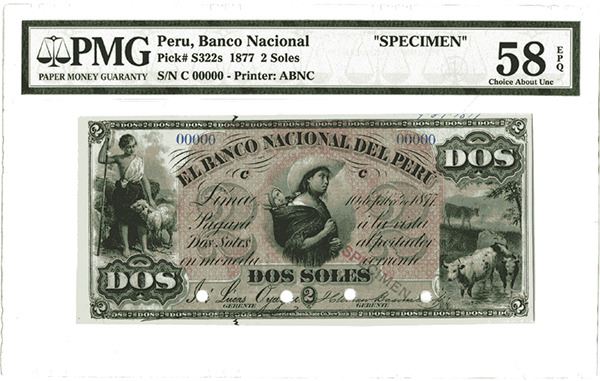 Lima, Peru. 2 Soles, P-S322s Specimen Black on green and red underprint, Specimen overprint, POC's Archival notation on top right margin, Back Green, PMG graded Choice About Uncirculated 58 EPQ. ABNC. This is the only graded note in the PMG census.