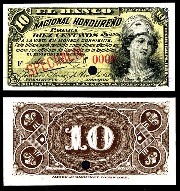 Honduras, specimen note, 10 Centavos, 1889, P-S151s. ABNC. UNC with SPECIMEN overprint and punch hole cancellation.