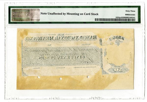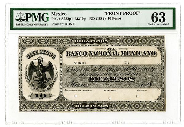 Mexico... 1882. 10 Pesos. P-S252p1. M310p, Obverse proof on india paper on card stock trimmed to banknote size. Black on light gold-brown underprint. National arms at center. PMG graded Choice Uncirculated 63. The back has stuck to it a partial 50 Pesos proof on india paper. ABNC.