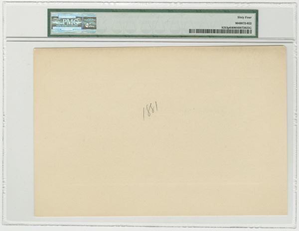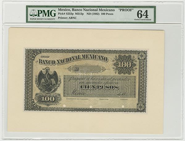 MexicoĆ’. ND (1882). P-S253p. 100 Pesos. Large Die Obverse proof on card stock with large margins. Black on golden underprint. National arms at left. PMG graded Choice Uncirculated 64 and very rare in any form. ABNC.