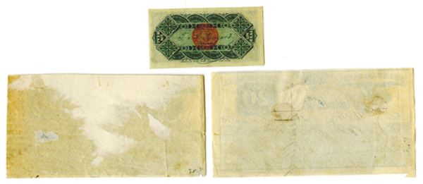 Colombia, lot includes from Banco Nacional de Colombia a 10 Centavos = 1 Real, 1885, P-181, unlisted Series N, UNC, ABNC; also included from the Correos Nacionales issue (Postal Money Orders?), 20 and 30 Centavos, handwritten dates 1890 and 1895, respectively. VF and unusual.