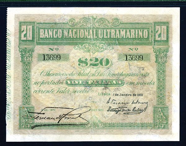 20 Patacas, P-4, Issued banknote, Green on gray underprint, back same color with arms at center, perforated left margin, S/N 13699, PMG graded Fine 12 NET with notation of reconstructed in middle lower back that was professionally done. BWC, printer. Only two graded in PMG census.
