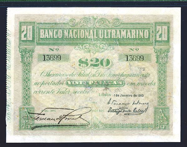 20 Patacas, P-4, Issued banknote, Green on gray underprint, back same color with arms at center, perforated left margin, S/N 13699, PMG graded Fine 12 NET with notation of reconstructed in middle lower back that was professionally done. BWC, printer. Only two graded in PMG census.