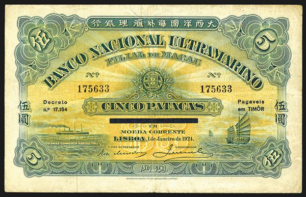 5 Patacas, P-6, Issued banknote, Green on yellow-orange underprint, back green, ÒPagaveis em TimorÓ at right on Macau #8, S/N 175633, PMG graded Very Fine 30 EPQ with claims to XF status, TDLR, printer. Only 4 graded in PMG census. Rare note in any grade.