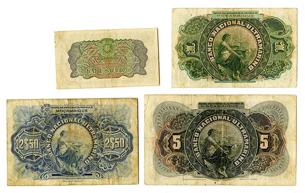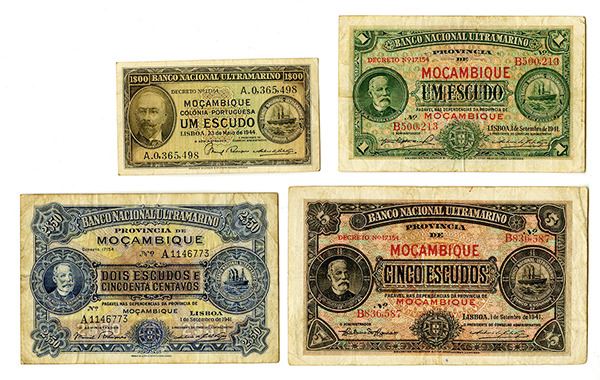 Mozambique, lot of 4 issued notes, includes 5 Escudos, 1941, P-83; 2-1/2 Escudos, P-82; 1 Escudo, 1941, P-81; and 1 Escudos, 1944, P-92. Generally Very Fine.