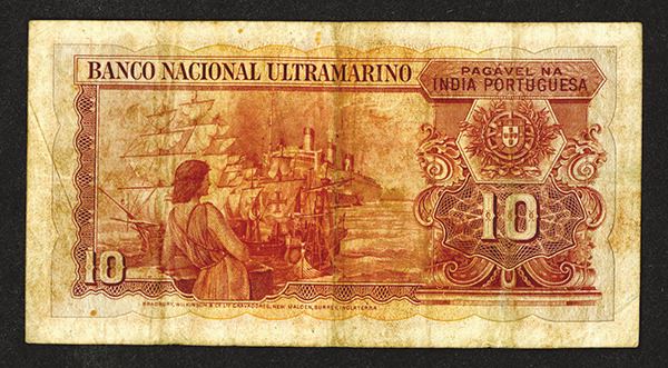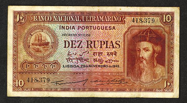 Portuguese India. 10 Rupias. SCWPM 36. Afonso de Albuquerque at right. BW&Co imprint. Fine, soiled, the back more so.
