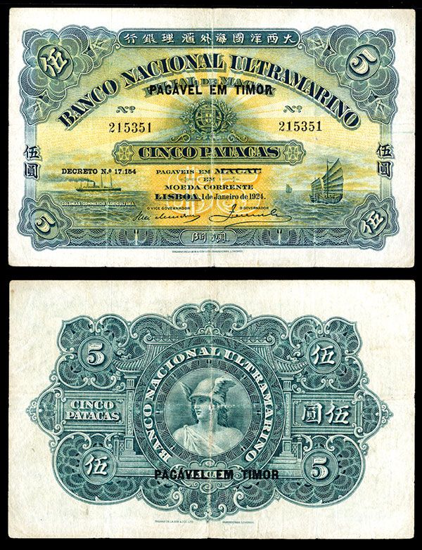 Timor, ND (1945 - old date 1924), 5 Patacas, P-10, Printed on Macao P-8, Issued banknote, Green on yellow underprint, Overprinted “Pagavel Em Timor”. PMG graded Very Fine 25, with large margins, sharp corners and bright colors enhancing this rare note. Priced at $1000 in Fine, this beauty is a strong VF. TDLR.