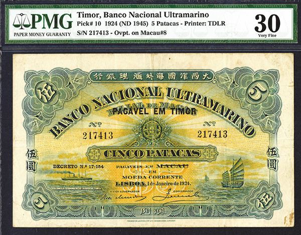 Timor, ND (1945 - old date 1924), 5 Patacas, P-10, Printed on Macao P-8, Issued banknote, Green on yellow underprint, Overprinted "Pagavel Em Timor". S/N 217413, PMG graded Very Fine 30, with large margins, sharp corners and bright colors enhancing this rare note. Priced at $1000 in Fine, this beauty is a strong VF. TDLR.