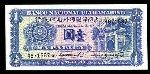Macau, 1 Pataca, P-28, blue on red and green underprint, PMG graded Gem Uncirculated EPQ. Attractive note for issue.
