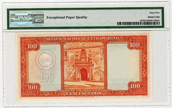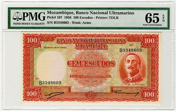 Mozambique. Issued 100 Escudos, 1958, P-107. PMG graded Gem Unc 65 EPQ (Cert # 5003617-003). TDLR.