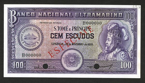 Saint Thomas and Prince, 100 Escudos, P-38s, Specimen, unpriced in SCWPM, Res Especime overprint and POC's, Choice to Gem Uncirculated, BWC.