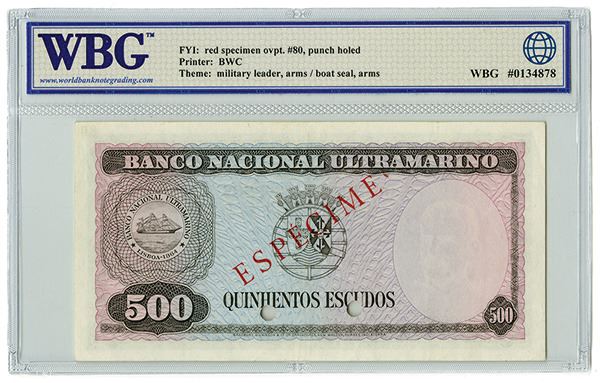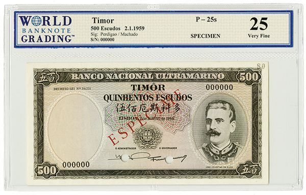 Timor. Specimen 500 Escudos, 1959, P-25s. WBG Very Fine 25. BWC.
