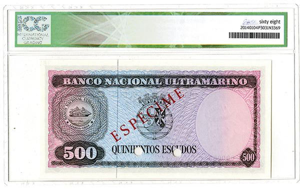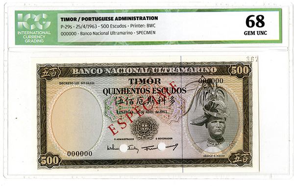 Timor. Specimen 500 Escudos, 1963, P-29s. ICG Gem Unc 68. BWC.
