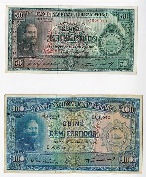 Portugues Guinea. Issued 50 Escudos, 1964, P-40; and 100 Escudos, 1964, P-41. Fine to Choice Fine.
