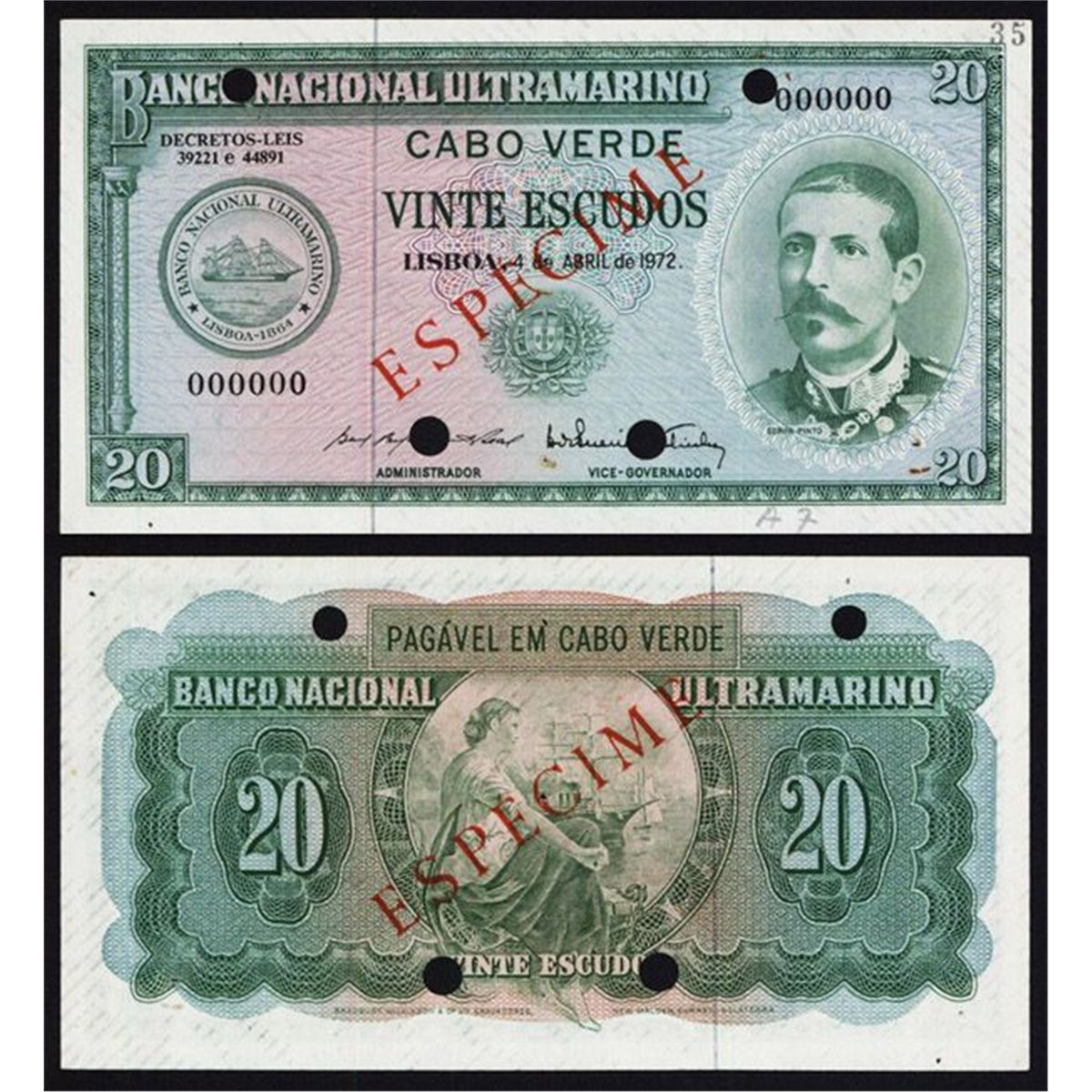 Cape Verde, 1972, 20 Escudos, P-52s, Specimen, Green on m/c, Pinto at right, back Green on m/c, Specimen overprints, POC's, choice XF to AU condition, “35” on top right corner. TDLR.