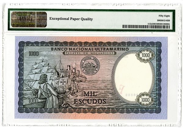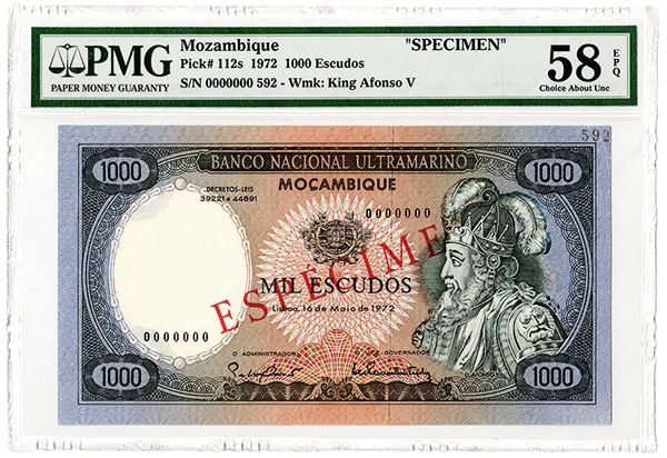 Mozambique. Specimen 1000 Escudos, 1972, P-112s. PMG graded Choice About Unc 58 EPQ (Cert # 5003612-020).