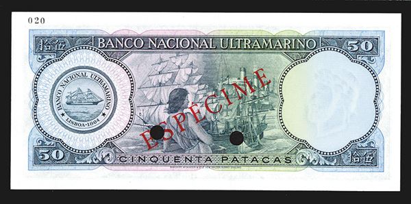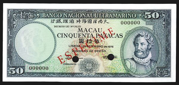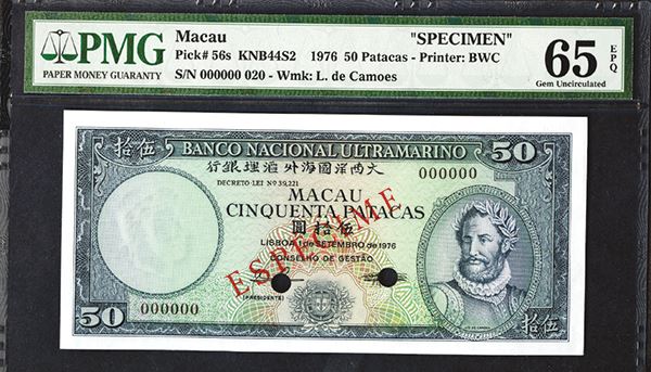 Macau. 1976, 50 Patacas, P-56s KNB44S2, Specimen, S/N 000000 020, PMG graded Gem Uncirculated 65 EPQ, very attractive note.