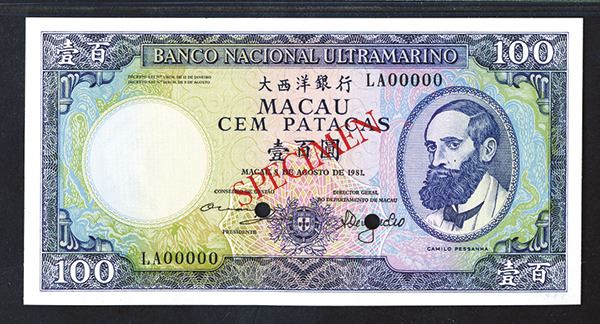 Macau. 1981, 100 Patacas, P-61s1 KNB55S2-S2, Specimen, S/N LA00000 051, Signature title - Presidente at Left, PMG graded Gem Uncirculated 66 EPQ, very attractive note.