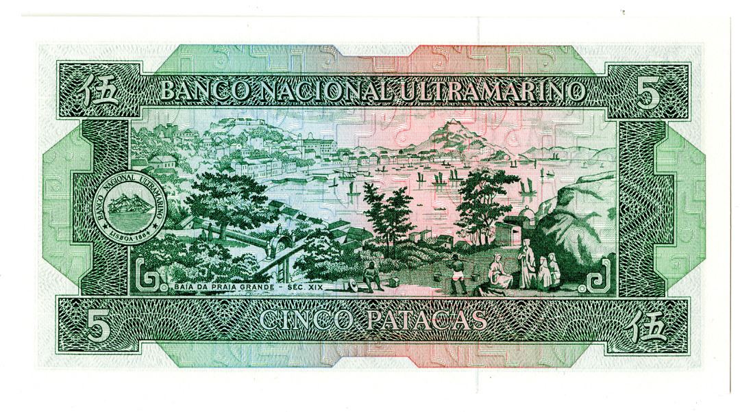 Macauƒ.. 1981. 5 Patacas, P-58c, Issued banknote, Green on multicolor underprint, S/N BV70062, Without signature title: PRESIDENTE at left, Unc to CU condition or better.