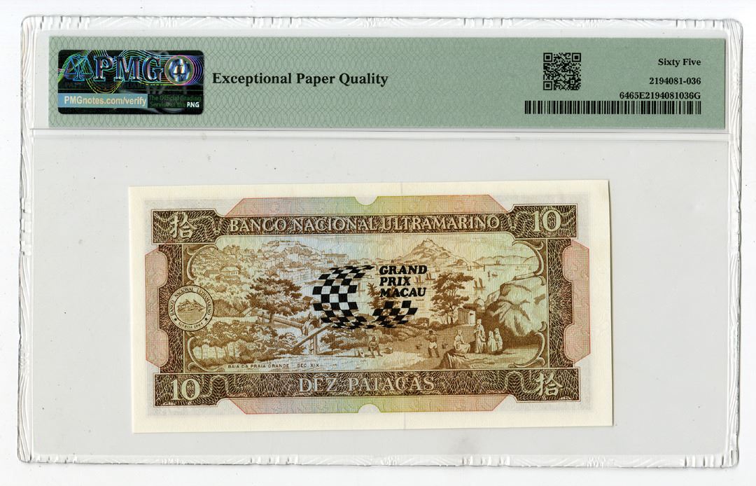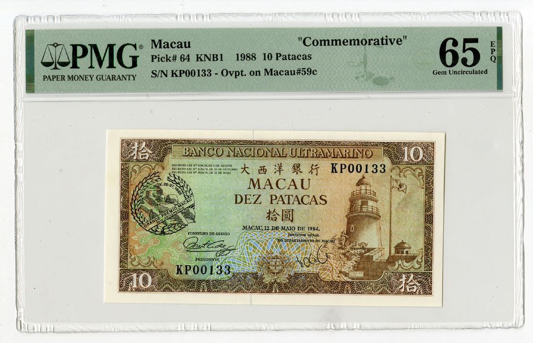 Macau, 1988. Grand Prix Macau, 10 Patacas, P-65 KNB1, Note is overprinted on P-59, Brown on m/c underprint with lighthouse and flag at right, Black overprint at left, Back is Brown with 19th century harbor scene and black overprint with checkered wheel, S/N KP00133, PMG graded Gem Uncirculated 65 EPQ.