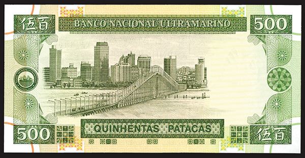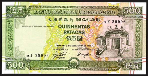 Macau, September 3, 1990, P-69a, olive-green on multicolor, building right. Uncirculated.