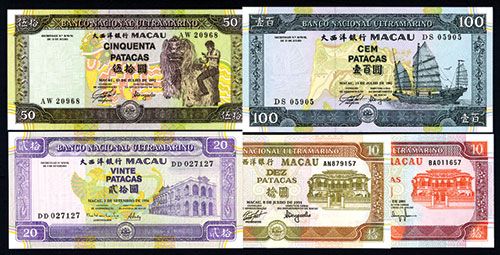 Macau, Lot of 5 notes, Includes 1991, 10 Patacas, P-65a, Choice VF to XF; 1996, 20 Patacas, P-66a, Choice to Gem Uncirculated.; 1992, 50 Patacas, P-67a, Choice to Gem Unc.; and 1992, 100 Patacas, P-68a, Choice Uncirculated; and, 2001, 10 Patacas, P-76a, Choice to Gem Uncirculated. Attractive assortment in high grade of these lovely Macau notes.