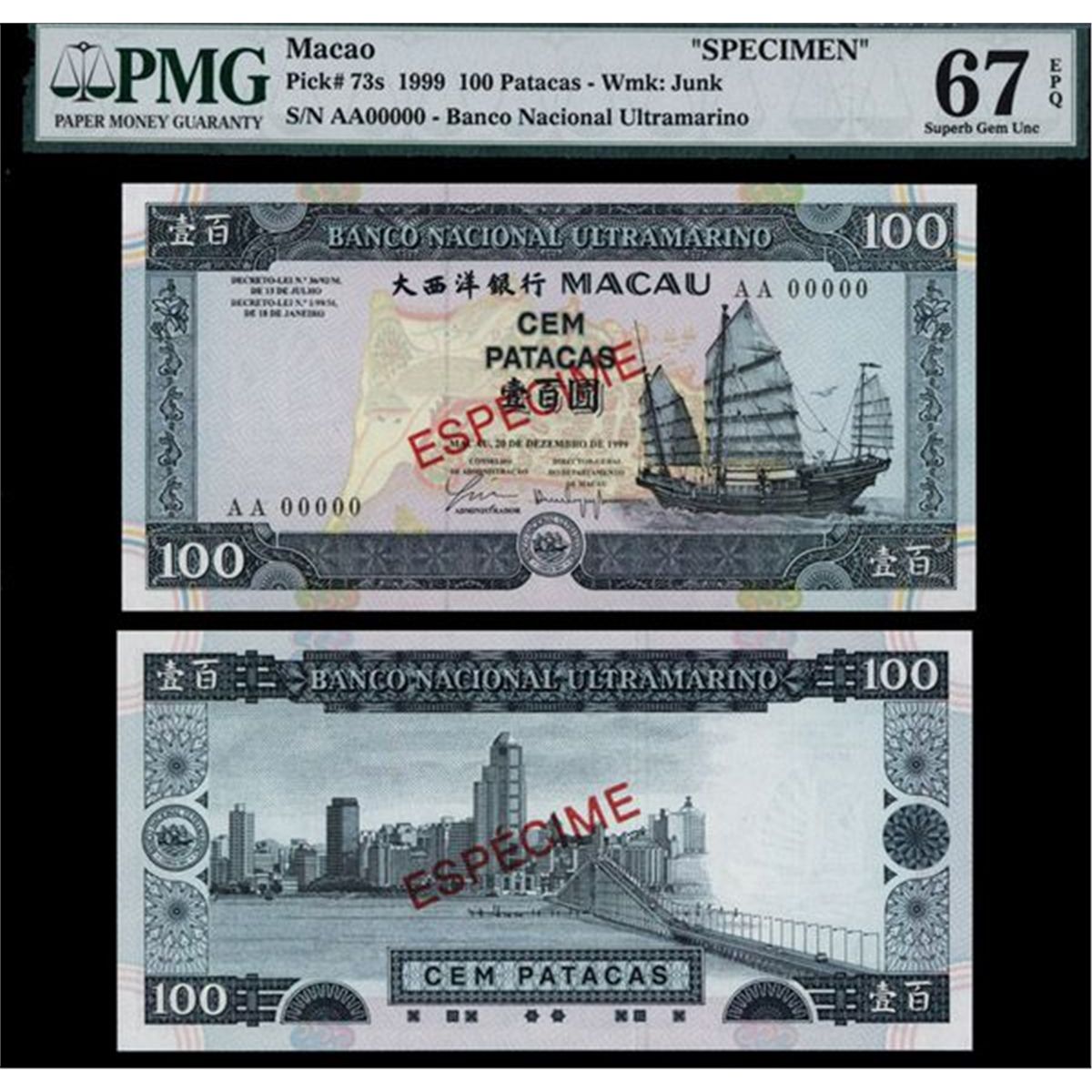 Macau, 1999, 100 Patacas, P-73s, Specimen, Black on m/c, Junk at right, PMG graded Superb Gem Uncirculated 67 EPQ (Exceptional Paper Quality), ESPECIME overprints, S/N AA 00000, Rarely seen in high grade and this may be close to condition consensus.