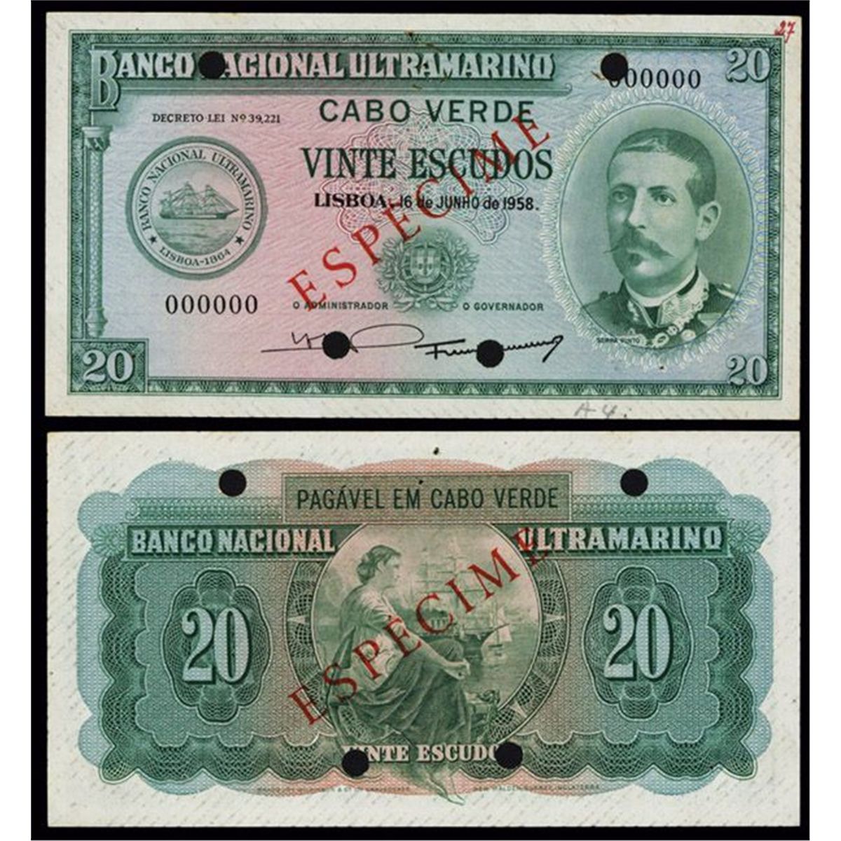Cabo Verde, 16th June 1958, 20 Escudos, P-47s, Specimen, Green on m/c underprint, Decreto Lei No. 39.221, Portrait of pinto on right and steamship seal on left, Back green on m/c with allegorical woman looking at sailing ships, SPECIMEN overprint in middle, POC's, 2 pin holes on top middle otherwise a very nice AU-Uncirculated note. BWC.