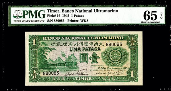Macau, 1 Patacas, P-16, Issued banknote, PMG graded Gem Uncirculated 65 EPQ. Scarce in high grade.