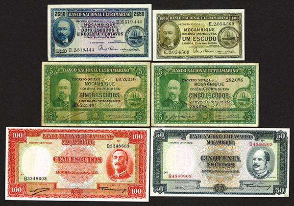 Mozambique. 1, 2.5, 5, 50, 100 Escudos. P-89, 92, 93, 94, 106 (two corners with tape remnants), 107. First group Fine-Very Fine, last two Uncirculated.