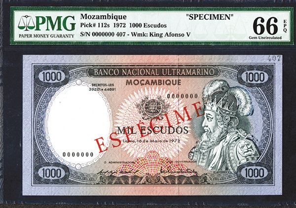 Mozambique. 1000 Escudos. P-112s. Alfonso V at right. Red ESPECIME overprint, stamped control # 407 at top right margin. Graded PMG Gem Uncirculated 66 EPQ.