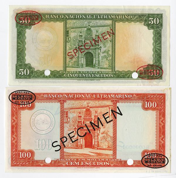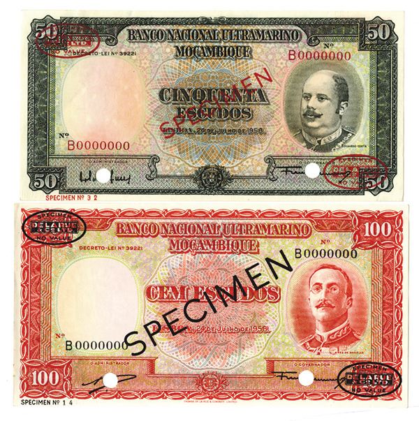 Mozambique, lot of 2 notes, Includes 50 Escudos, P-106s and 100 Escudos, P-107s (Unlisted as specimen). Both Uncirculated with evidence of prior mounting on the back right margins, both with oval TDLR specimen imprints and specimen overprint, POC's, S/N B0000000-32 and B0000000-14, both without "Colonia Portuguesa", TDLR.