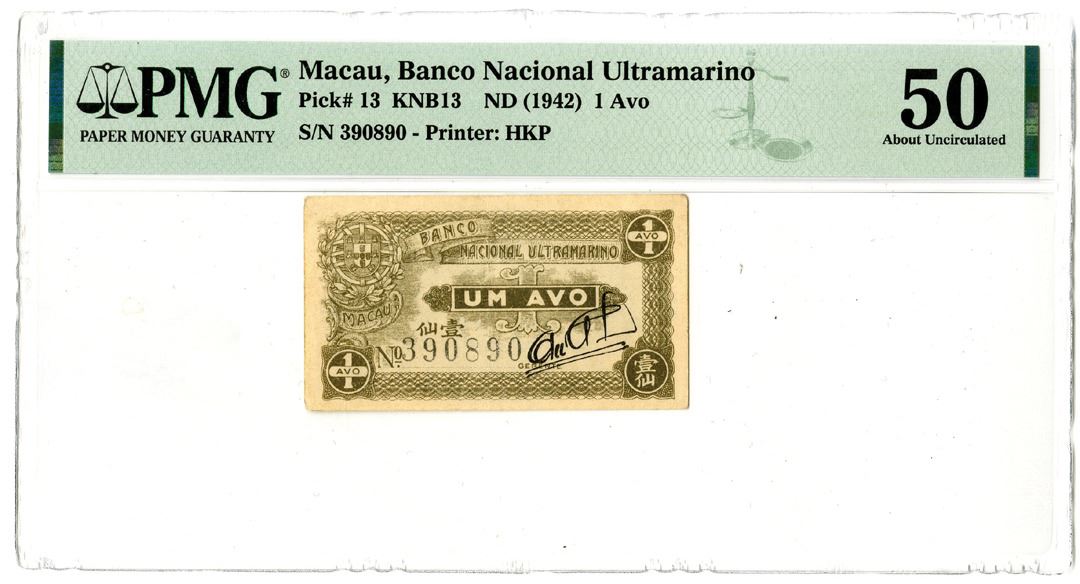 Macau. ND (1942). 1 Avo, P-13 KNB13, Issued banknote, Grayish brown on face, S/N 390890, PMG graded About Uncirculated 50. Printed: HKP.