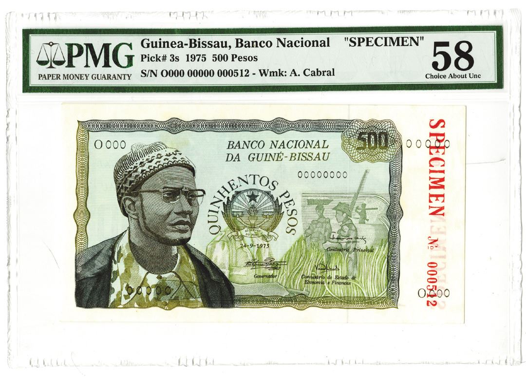 Guinea-Bissau. 1975. 500 Pesos, P-3s, specimen banknote, s/n O00000000, overprinted "SPECIMEN", PMG Graded Choice About Unc 58.